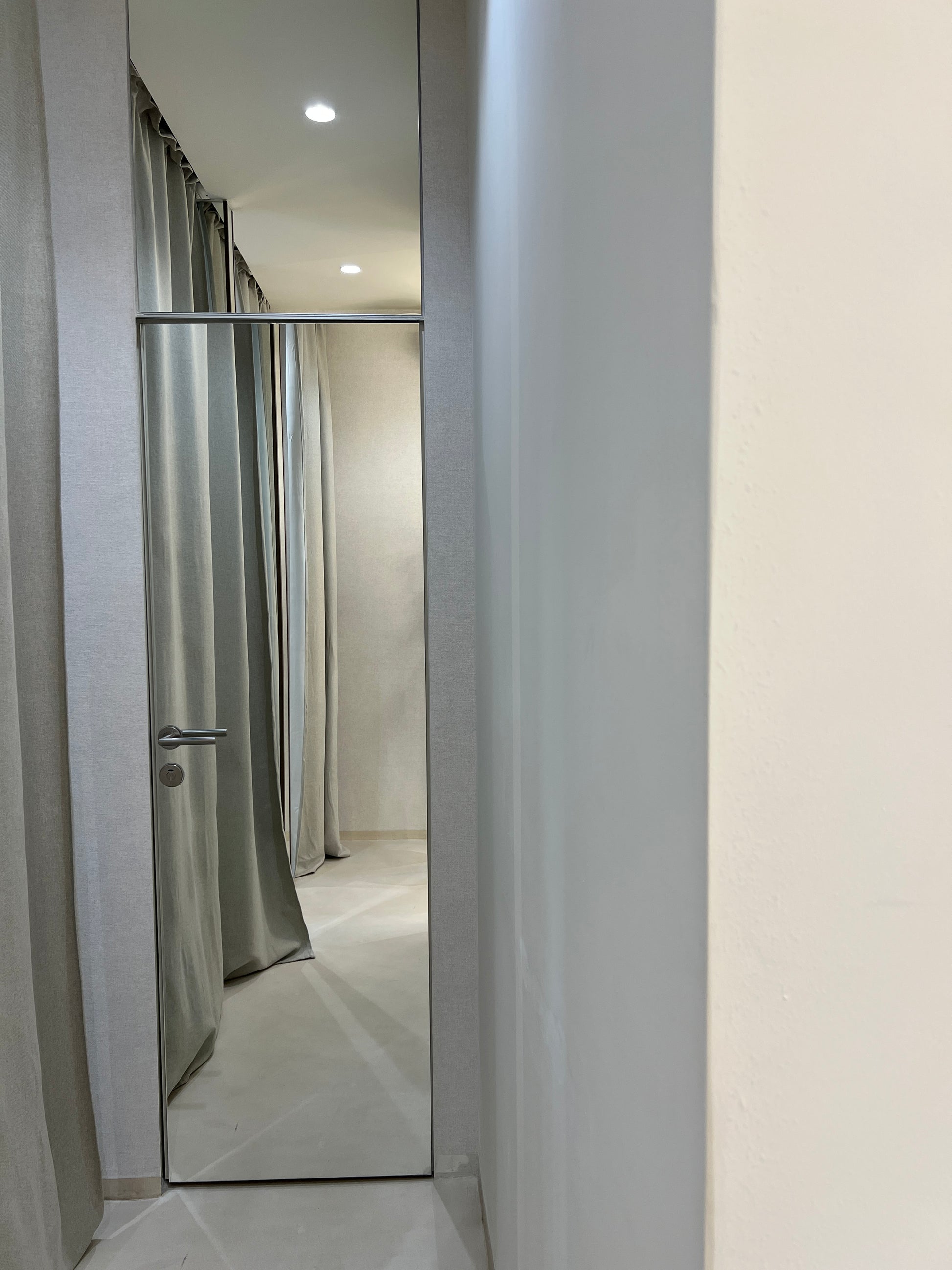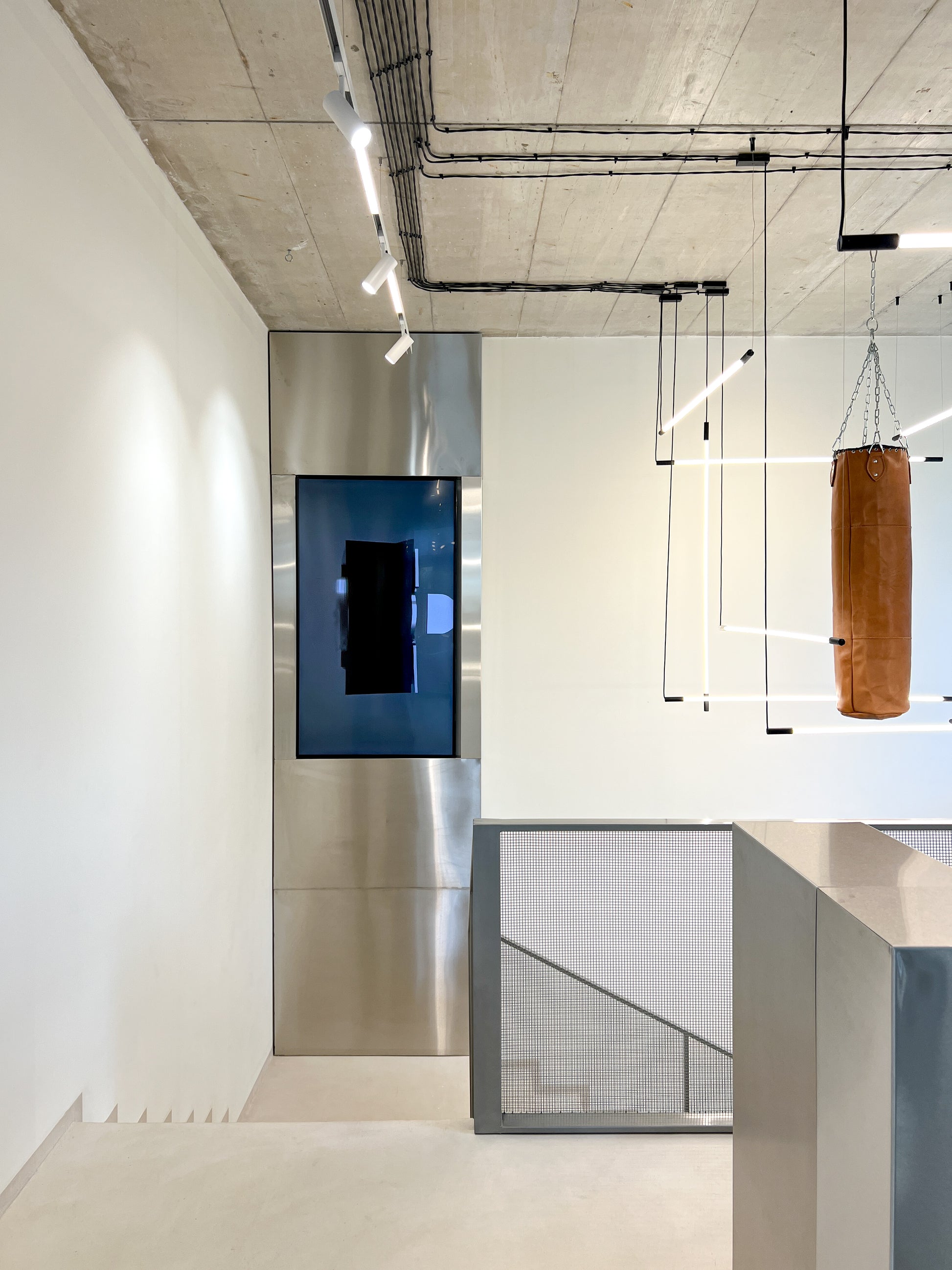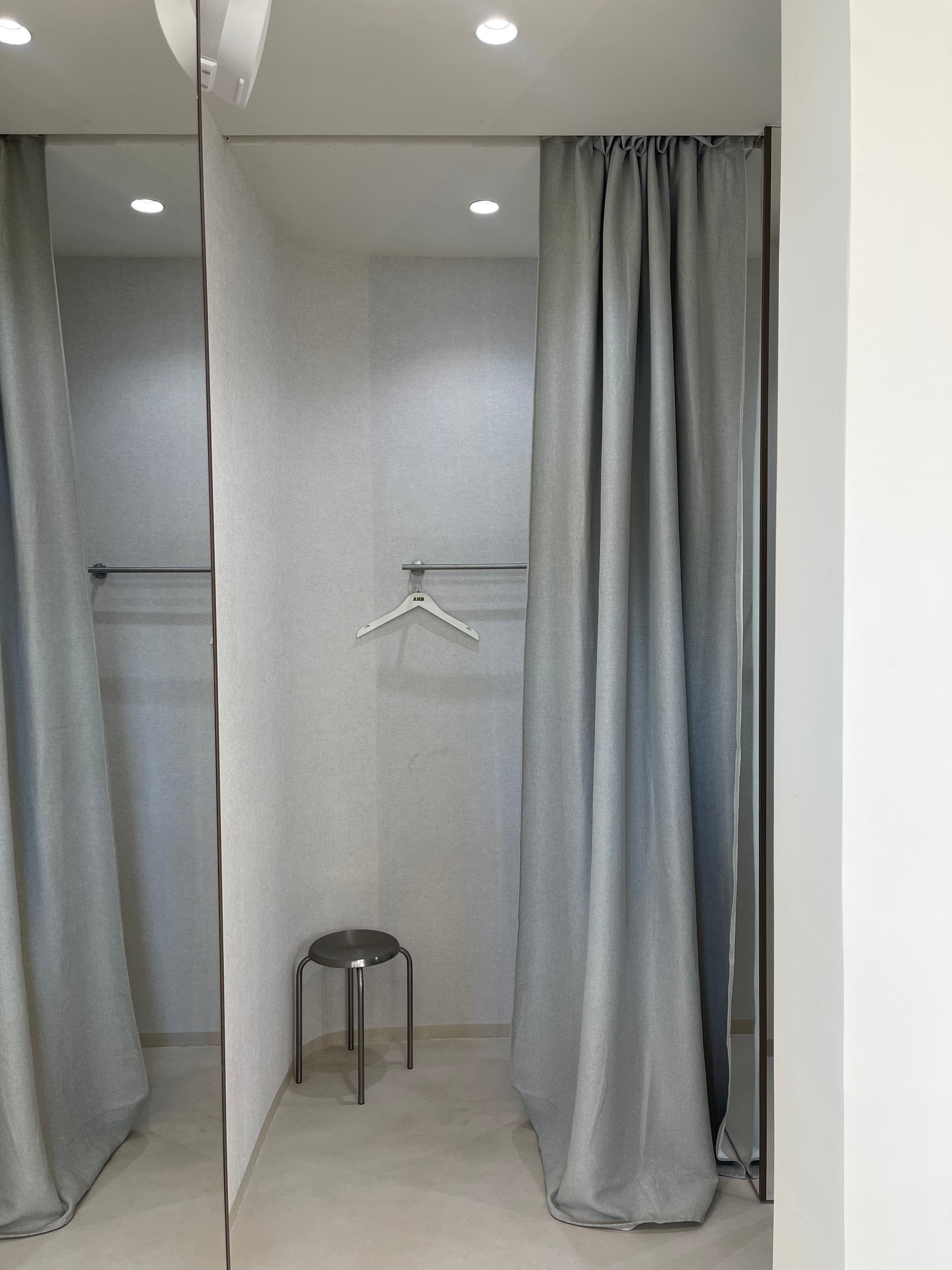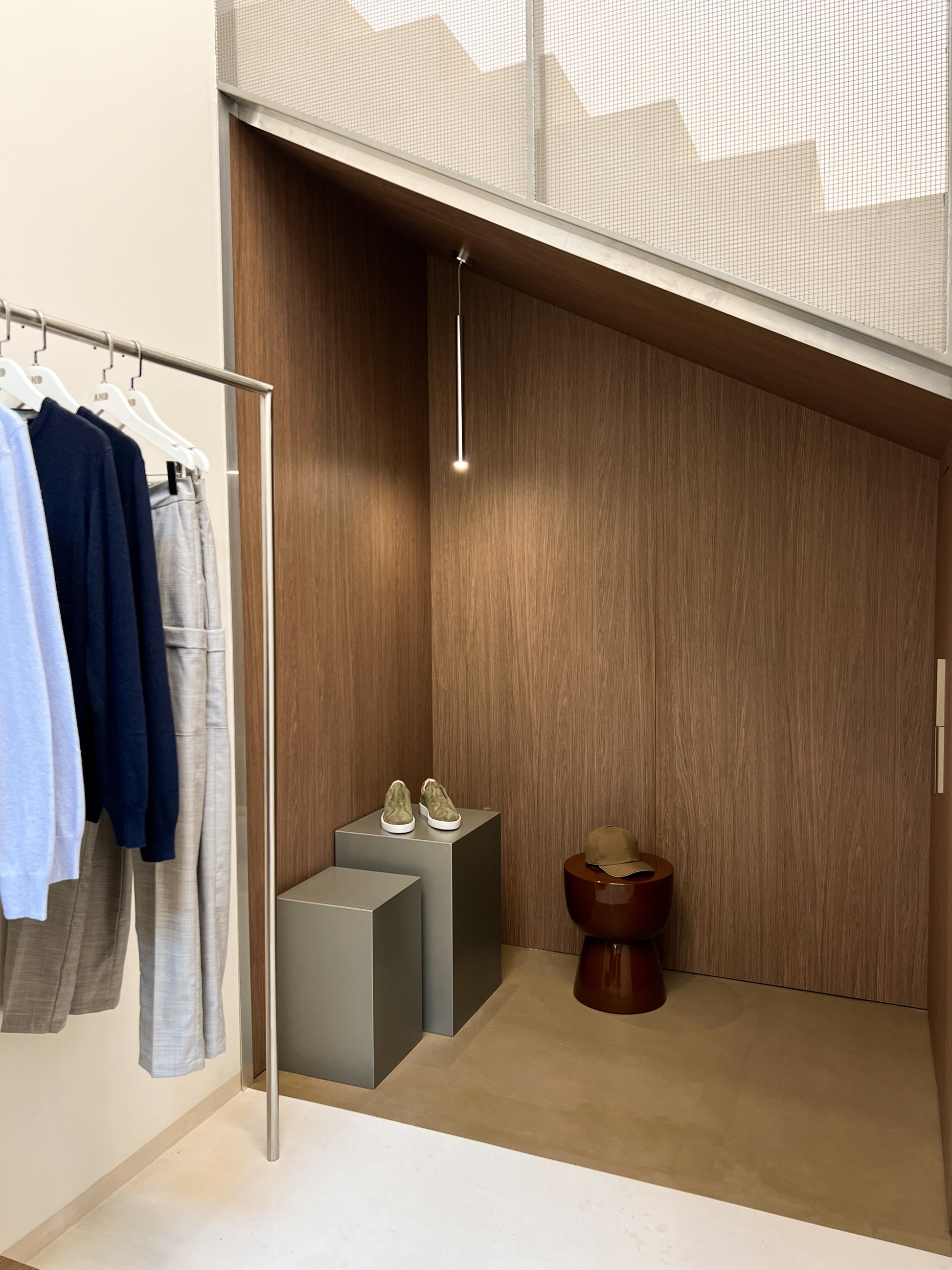 Всеки детайл в интериора е обмислен – от осветлението, което подчертава формите и материалите, до изчистеното разположение на пространството, което насочва вниманието към основното: мъжката мода в нейния най-съвременен вид.